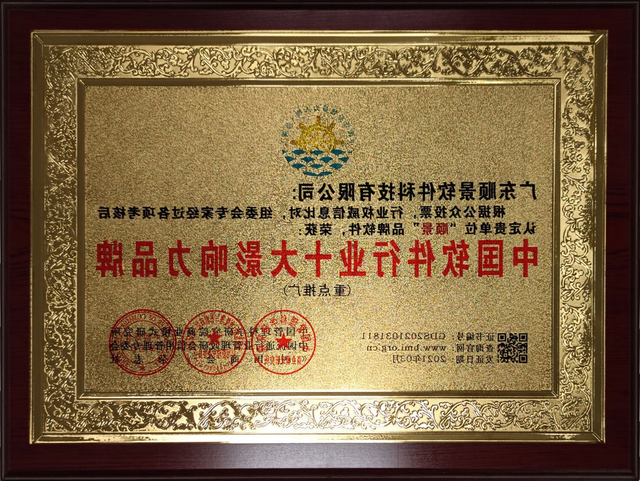 十大影响力品牌证书